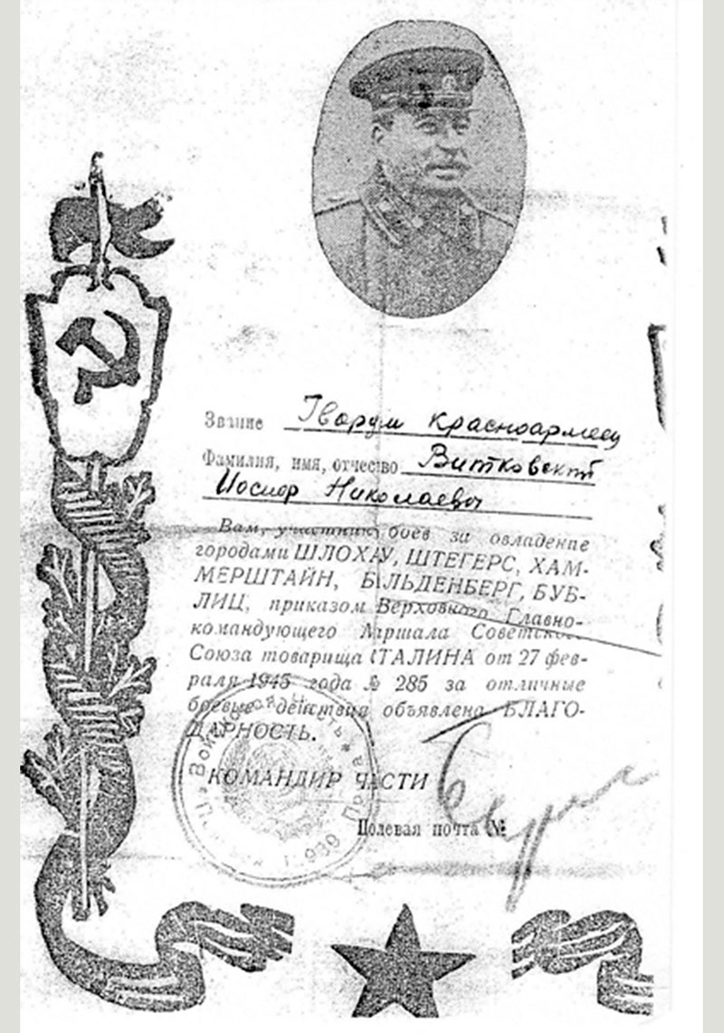 Благодарность за участие в боях за овладение городами Витковскому И.Н