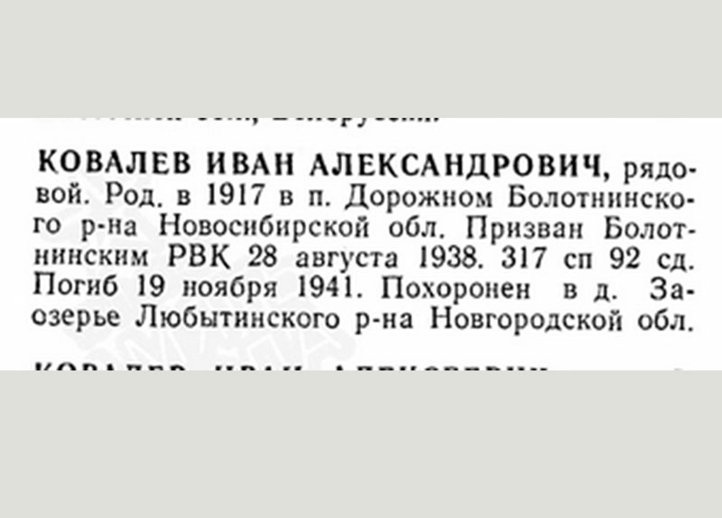 Боевой путь: воевать Ивану Ковалеву не пришлось. По дороге на фронт, между Ленинградом и Москвой, эшелон попал под бомбежку. Иван вместе с другими однополчанами погиб. Похоронен был в братской могиле в деревне Заозерье Любытинского района Новгородской области.