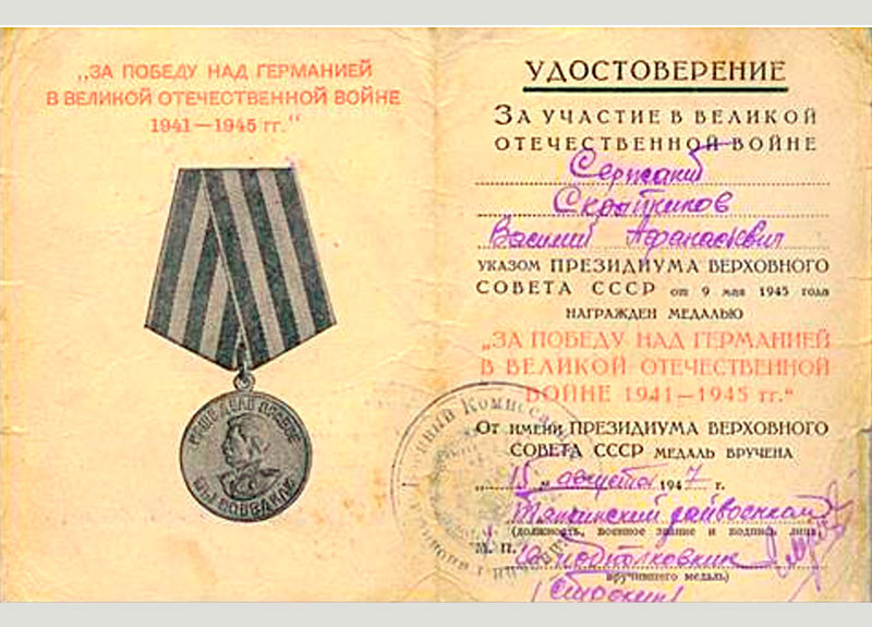 Удостоверение к медали «За Победу над Германией в Великой Отечественной войне 1941 – 1945 гг.». 1945 г.
