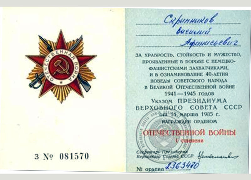 После войны: после длительного лечения Скрипников В.А. был освобожден от воинской обязанности и отправлен домой в село Бороковка Тяжинского района. Прошел курсы повышения квалификации, работал техником в совхозах Тяжинского района. Василий Афанасьевич с женой Анной Филипповной вырастили шестерых детей. Все годы совместной жизни вели большое подсобное хозяйство.