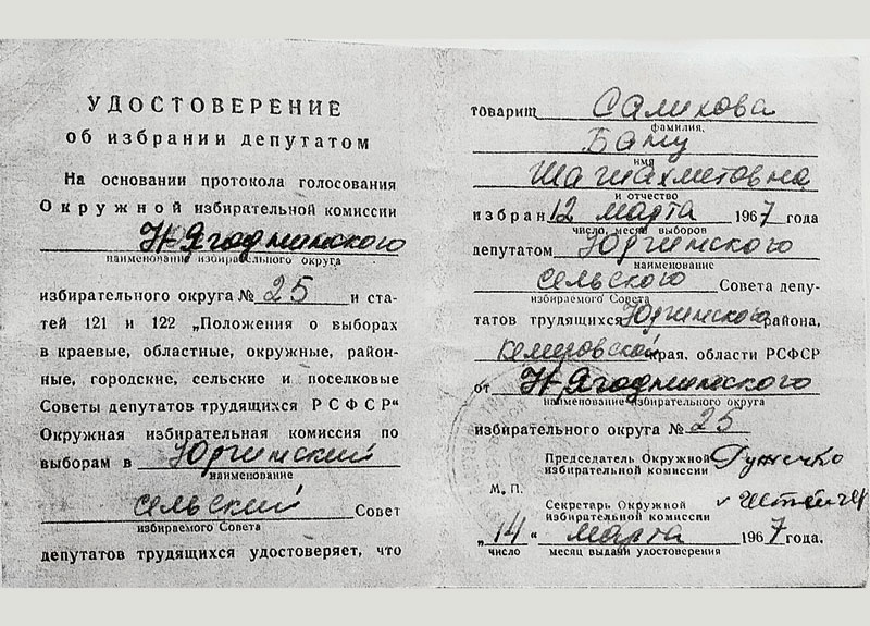Во время войны: по решению райотдела 16 мая 1943 года Бану Шаяхметовна была направлена на курсы счетоводов, окончив которые приехала работать на станцию Юрга-1 в колхоз «Нариманова». Она не только хорошо трудилась, но и была активной комсомолкой. В годы войны ее избрали председателем комсомольской организации. Тогда именно на комсомольцев была возложена большая агитационная работа. Бану проводила просветительскую работу среди населения, читки газет, разъясняла обстановку на фронте.